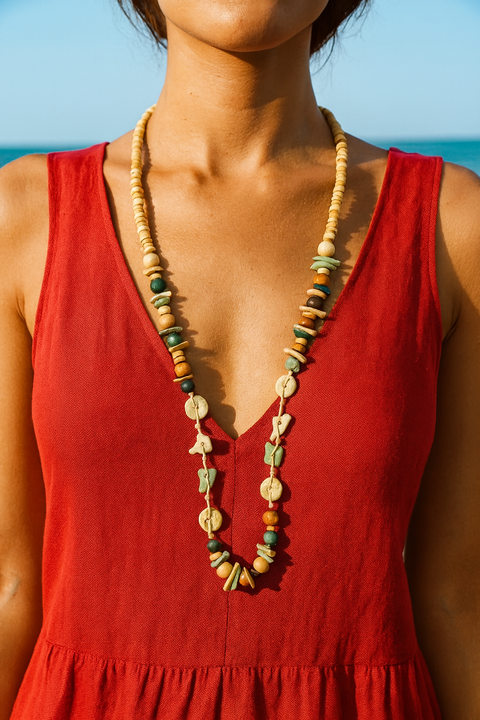 Un collar artesanal de maderas con tonos pasteles, de 40cm.