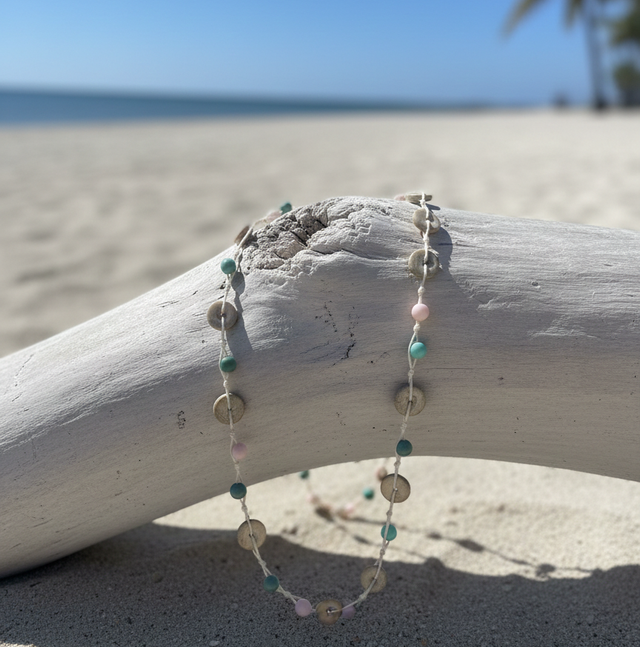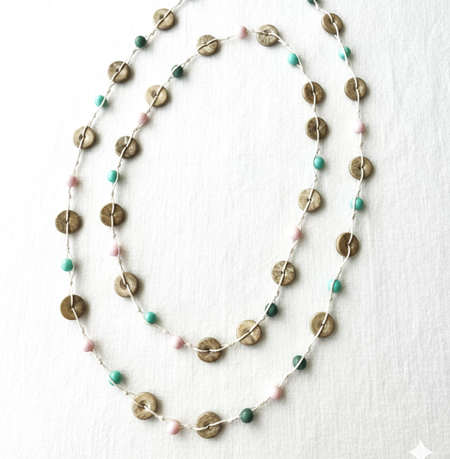 Collar tejido con maderas artesanal torneada, de color natural y cuentas acr{ilicas de colores pasteles.
